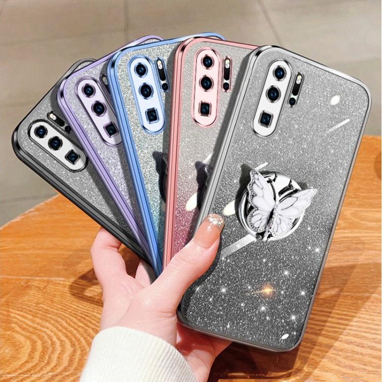 - 1x Funda TPU para Huawei P30 Pro con Soporte de mariposa y brillo degradado (Rosa)