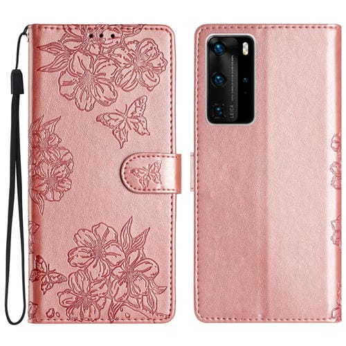 Funda para Huawei P40 Pro Cherry Blossom Butterfly Skin Feel de PU en Relieve (Oro Rosa)