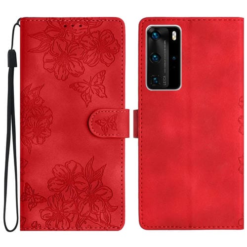 Funda para Huawei P40 Pro Cherry Blossom Butterfly Skin Feel de PU en Relieve (Rojo)