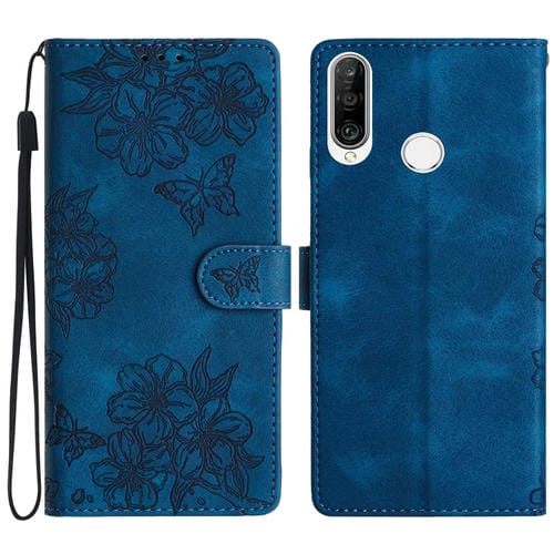 Funda para Huawei Y6P Cherry Blossom Butterfly Skin Feel de PU en Relieve (Azul)