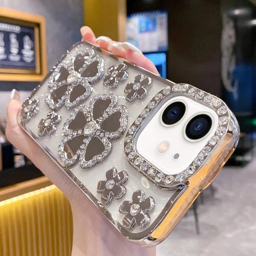 Funda para Teléfono TPU iPhone 11 con Diamantes y Flores Galvanoplastia (Plateada)