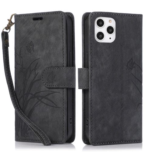 For iPhone 11 Pro Orchid Butterfly Embossed Leather Phone Case (Black)