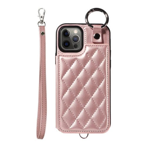 Estuche para Teléfono iPhone 12/12 Pro con Bolsa para Tarjetas Textura Rómbica y Cordón Corto (Oro Rosa)