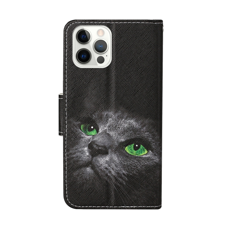 Funda de Cuero para iPhone 12/12 Pro con Patrón de Dibujo Coloreado, Tapa Horizontal, Soporte y Ranuras para Tarjetas (Gato Negro)