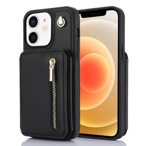 Estuche para teléfono Ym006 para iPhone 12/12 Pro con bolsa para tarjetas y cremallera con cordón doble (Negro)