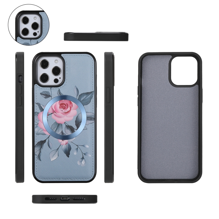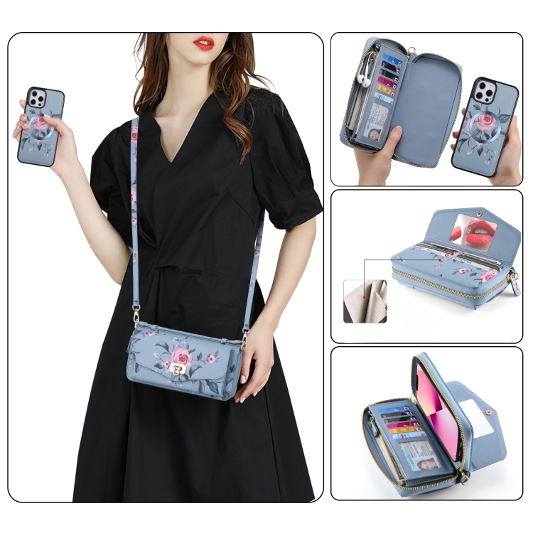 Funda de Cuero para iPhone 12 con Billetera Cremallera Cruzada Multifuncional Magsafe Flower (Azul)