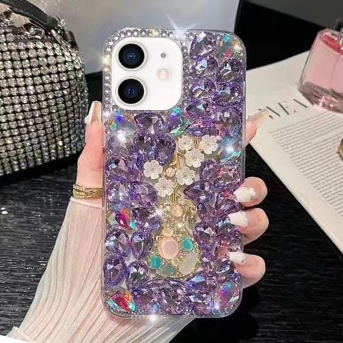 Funda para Teléfono iPhone 12 con Incrustaciones de Diamantes y Flor de Ciruelo (Púrpura)