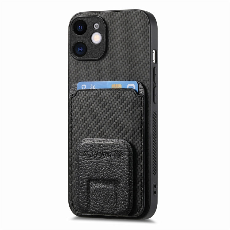 Funda para Teléfono iPhone 12 con Soporte Plegable y Bolsa para Tarjetas Fibra de Carbono (Negro)