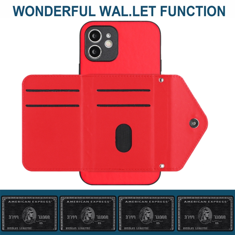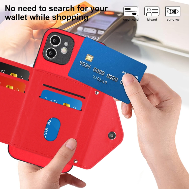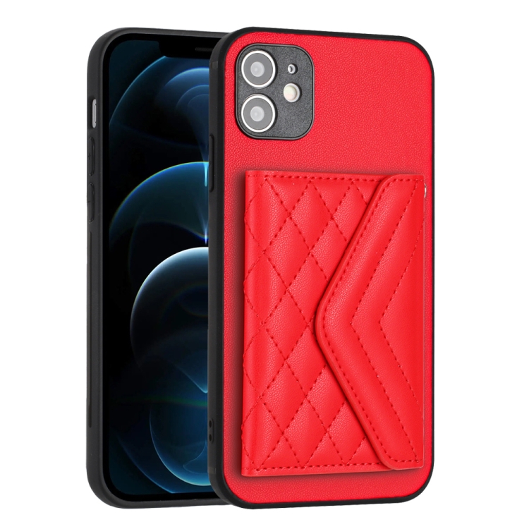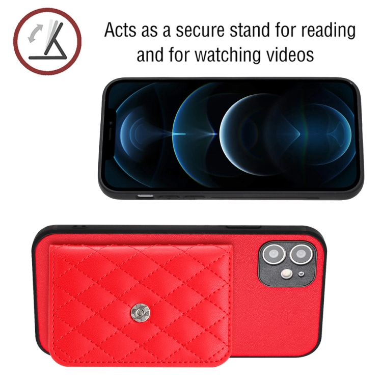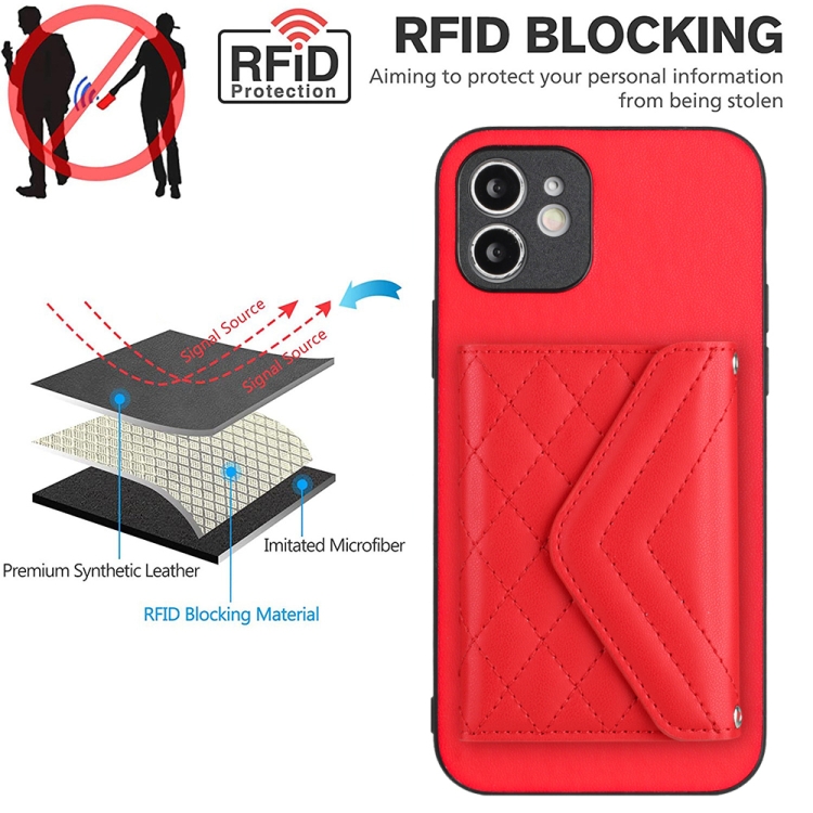 Funda para Teléfono iPhone 12 con Bolsa para Tarjetas Rfid Textura Rómbica y Cordón Largo (Rojo)