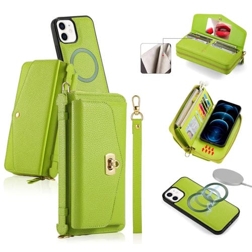 Funda para Teléfono iPhone 12 Magsafe Crossbody Cartera Multifuncional con Cremallera de Cuero Litchi (Verde)