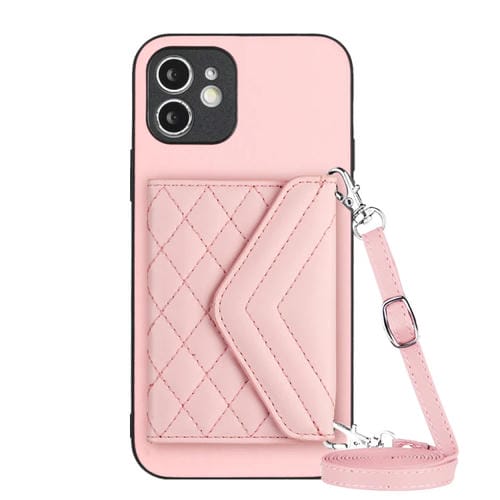 Estuche para Teléfono iPhone 12 Mini con Bolsa para Tarjetas Rfid Textura Rómbica y Cordón Largo (Oro Rosa)