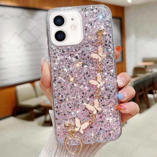 Funda para iPhone 12 Mini TPU Epoxi con Cadena de Mariposa y Lentejuelas Estrelladas (Rosa)