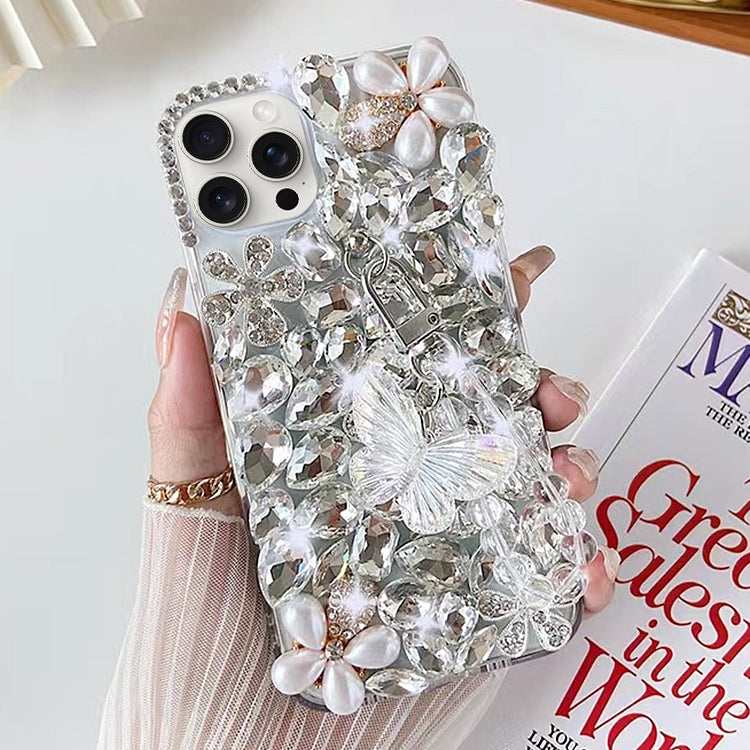 Caja para iPhone 12 Pro Max PC con Incrustaciones de Diamantes de Mariposa Hecha a Mano (Blanco)