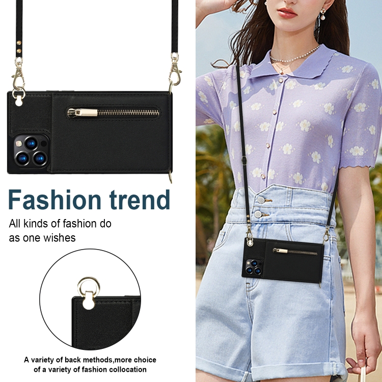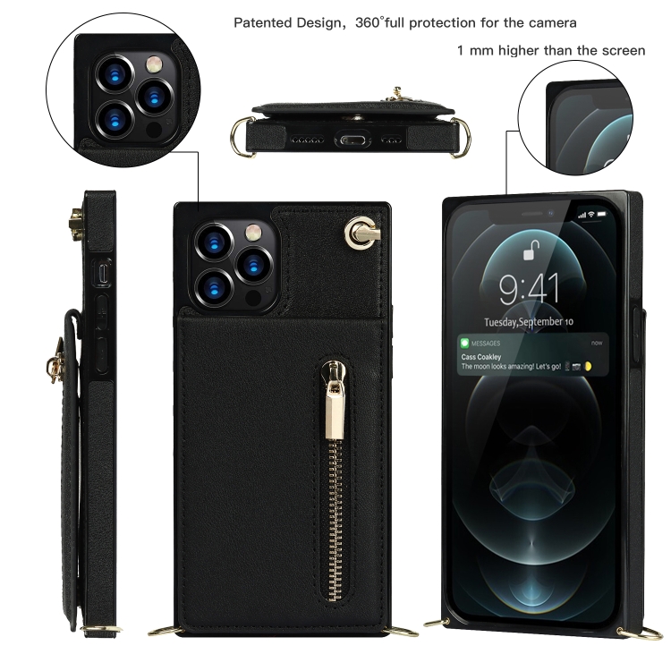 Funda Trasera para iPhone 12 Pro Max Cross-Body Zipper Square TPU + PU con Soporte, Ranuras para Tarjetas y Correa (Negro)