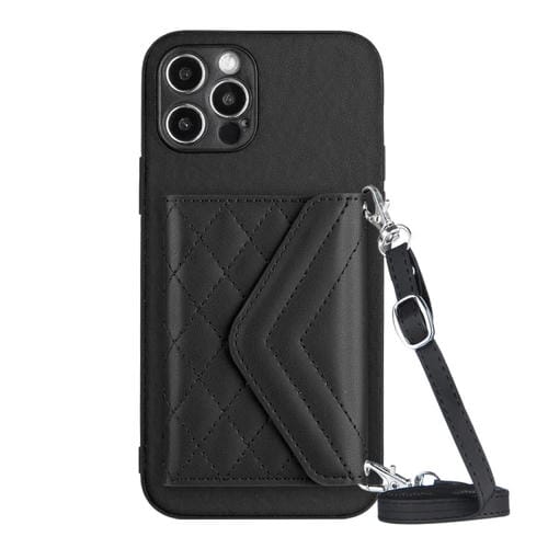 Estuche para Teléfono iPhone 12 Pro Max Rfid con Bolsa para Tarjetas Textura Rómbica y Cordón Largo (Negro)