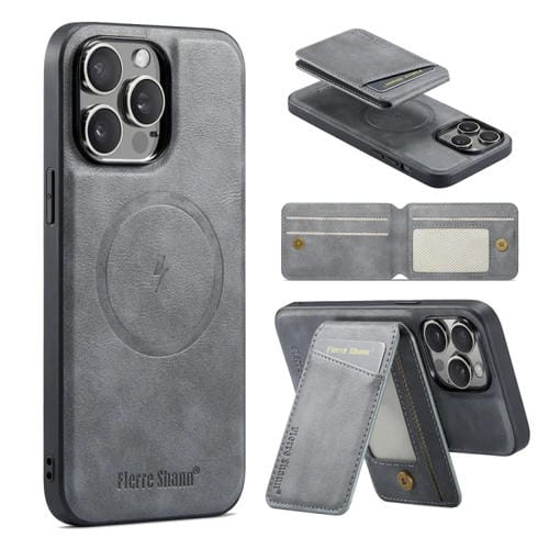 Funda para teléfono Fierre Shann iPhone 12 Pro Max Oil Wax con tarjetero magnético de cuero de vaca (Gris)