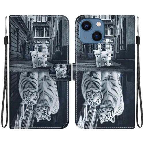 Funda de Cuero para iPhone 13 con Dibujo Coloreado y Textura de Cristal (Reflejo de Tigre Gato)