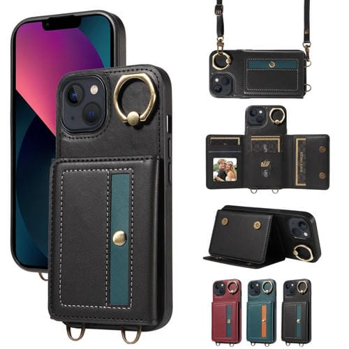 Funda para Teléfono iPhone 13 Cuero con Soporte para Anillo y Bolso Cruzado para Tarjetas (Negro)