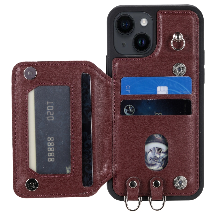 For iPhone 13 Phone Case with Card Holder Grid Texture and Lanyard (Red)