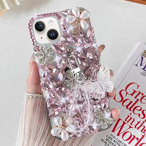 Funda para Teléfono iPhone 13 Hecha a Mano con Incrustaciones de Diamantes y Mariposas (Rosa)