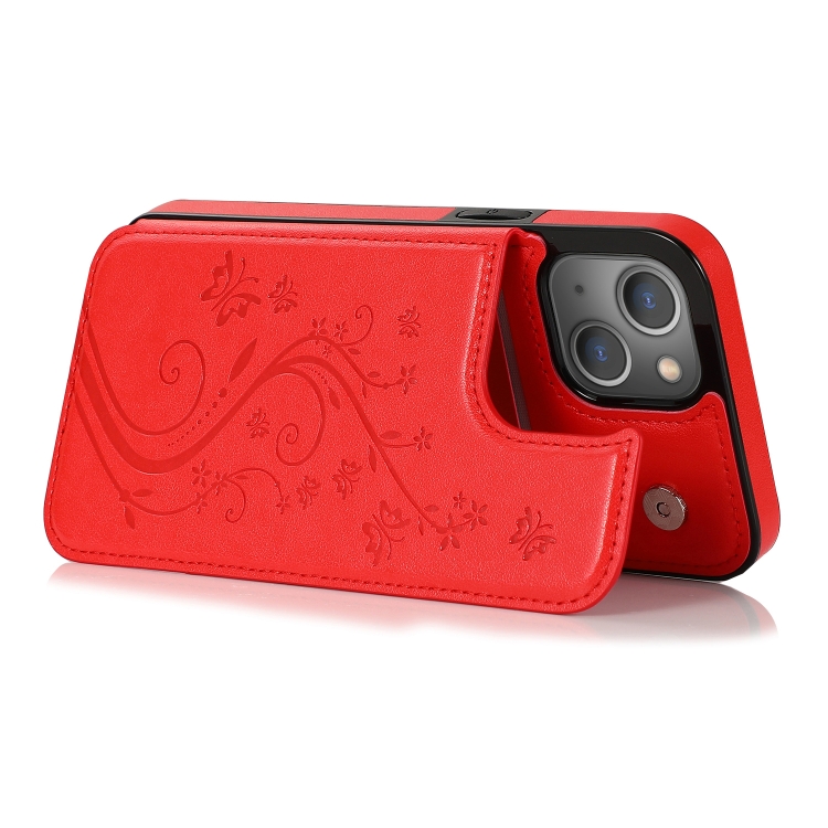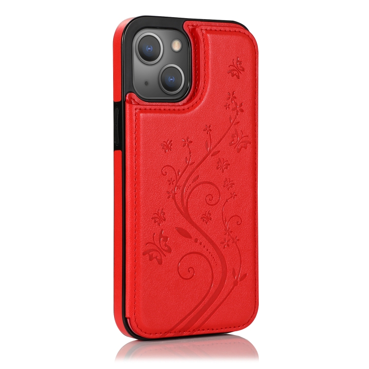 Funda Protectora para iPhone 13 Mini Mariposas Flores Doble Hebilla PU + TPU con Soporte y Ranuras para Tarjetas (Rojo)