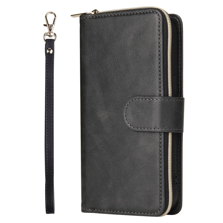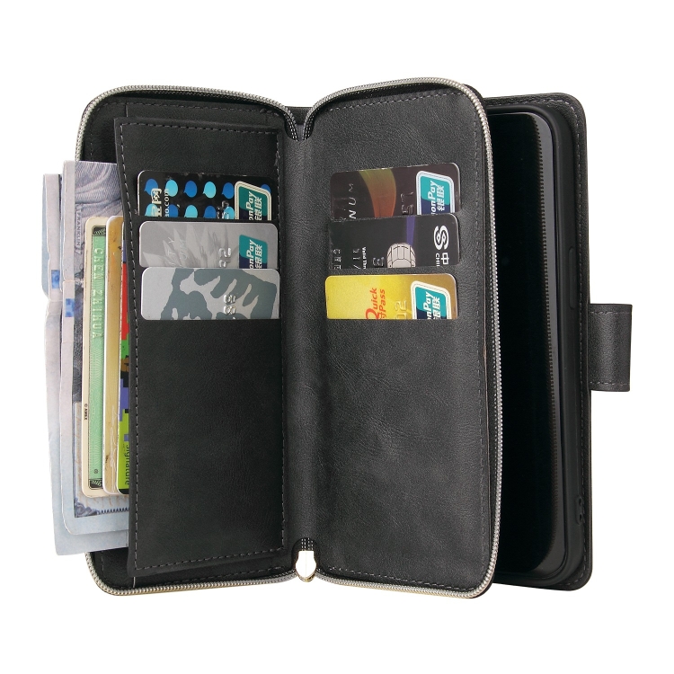Funda de Cuero para iPhone 13 Pro con 9 Ranuras para Tarjetas y Cremallera (Negro)