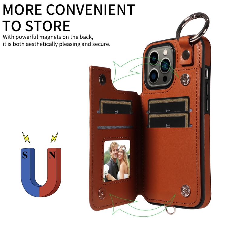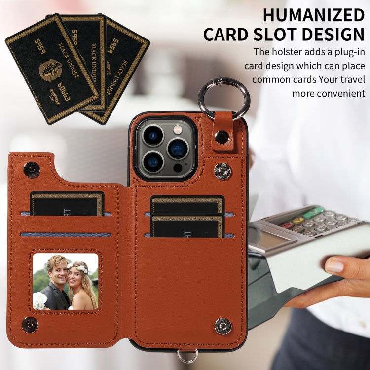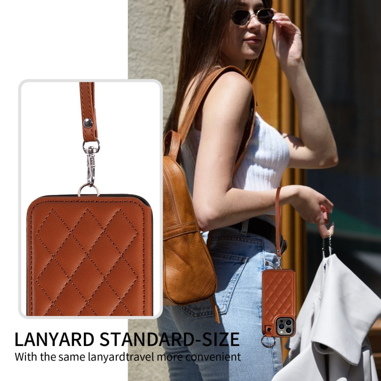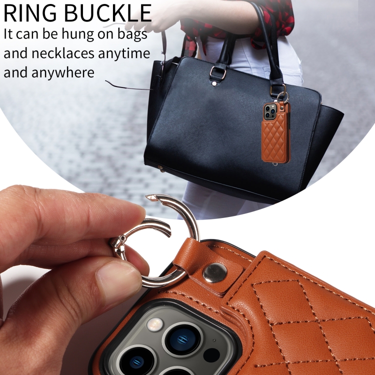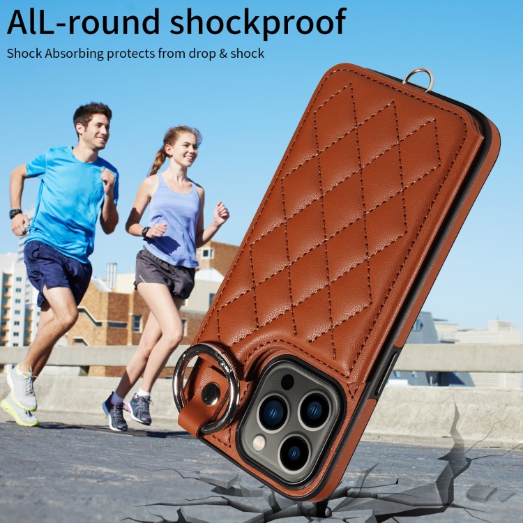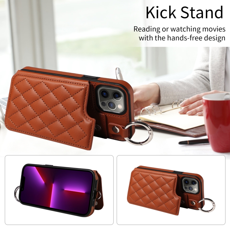 Estuche para Teléfono iPhone 13 Pro con Bolsa para Tarjetas Textura Rómbica y Cordón Corto (Marrón)