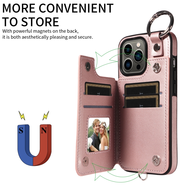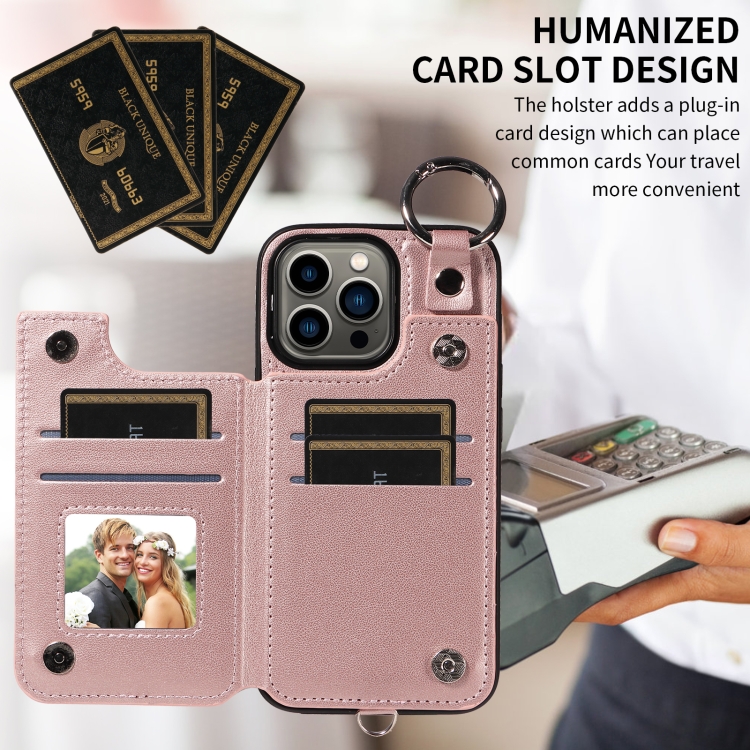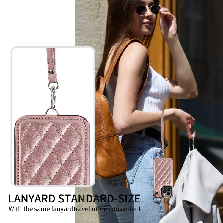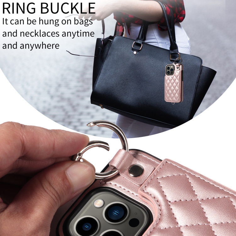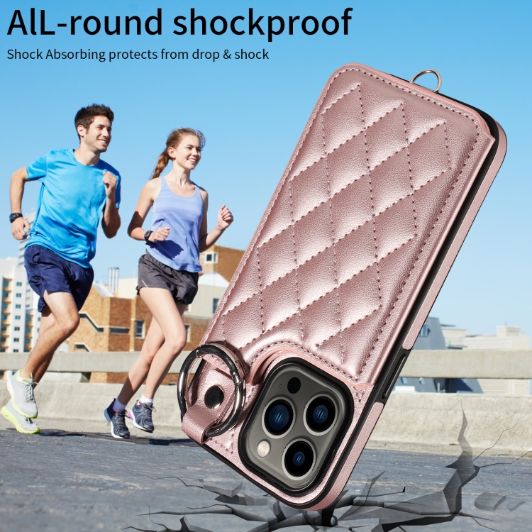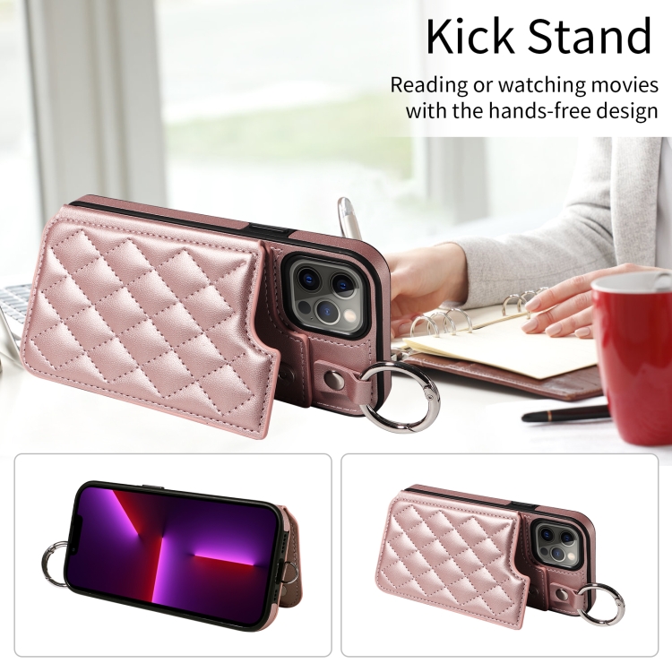 Estuche para Teléfono iPhone 13 Pro con Bolsa para Tarjetas Textura Rómbica y Cordón Corto (Oro Rosa)