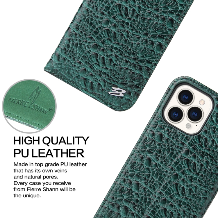 Funda para iPhone 13 Pro Fierre Shann Cuero Genuino Cocodrilo Textura Magnética Horizontal Flip con Soporte y Ranura para Tarjeta (Verde)