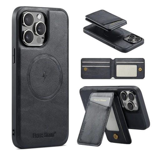 Funda para iPhone 13 Pro Fierre Shann Oil Wax con Tarjetero Magnético de Cuero de Vaca (Negro)