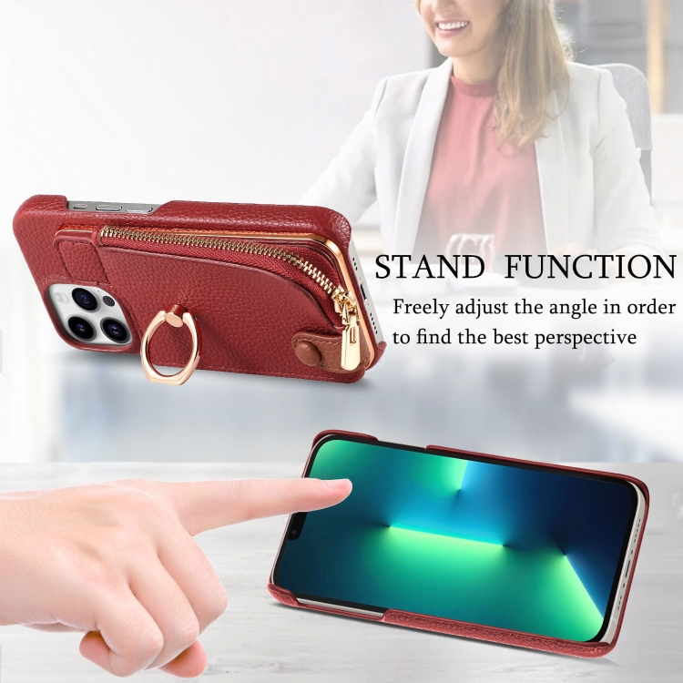 Funda Trasera para Teléfono iPhone 13 Pro con Billetera, Cremallera y Anillo de Cuero Litchi (Rojo)