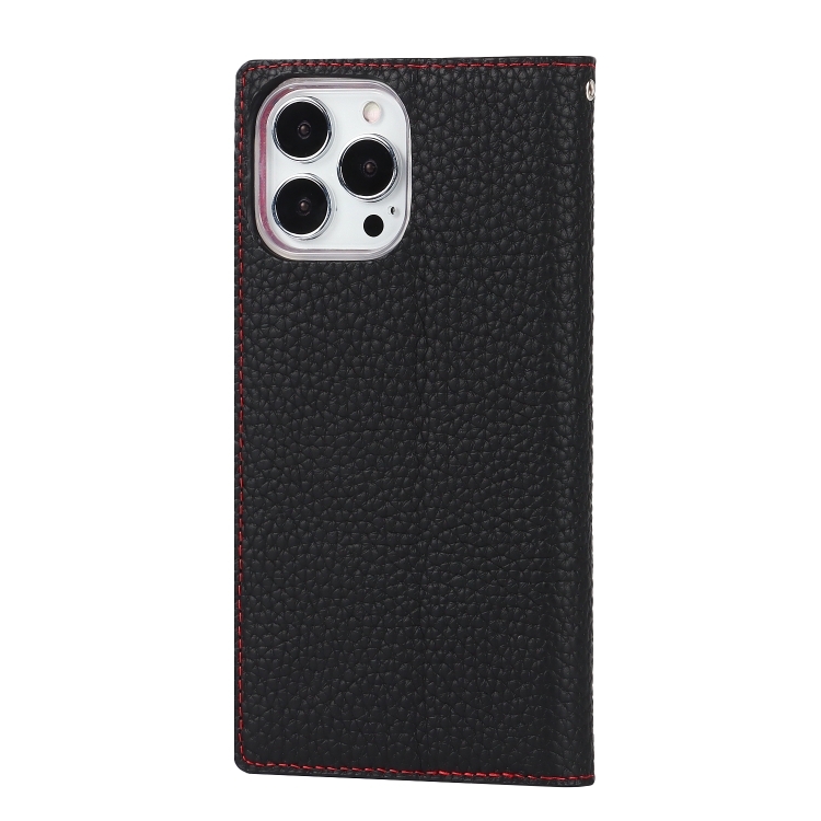 Funda de teléfono iPhone 13 Pro Cuero Genuino Litchi Texture con Cordón Soporte Ranuras para Tarjetas y Billetera (Negro)