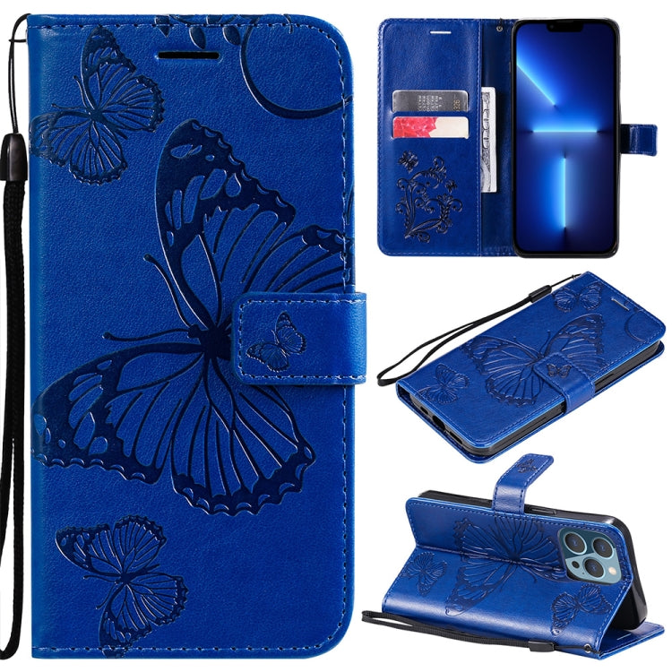 Estuche de Cuero para iPhone 13 Pro Max con Tapa Horizontal Patrón Mariposa 3D Soporte Ranura Tarjeta Billetera Cordón (Azul)