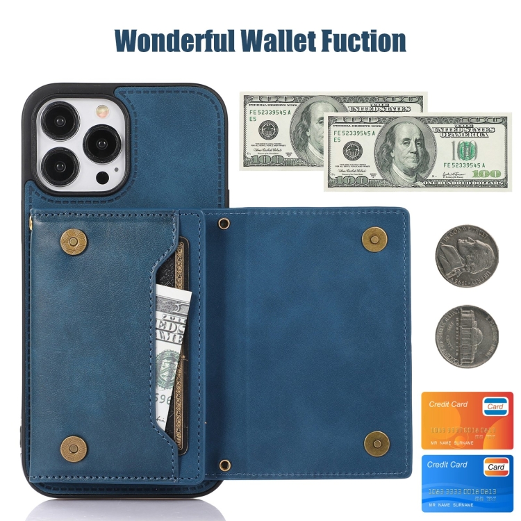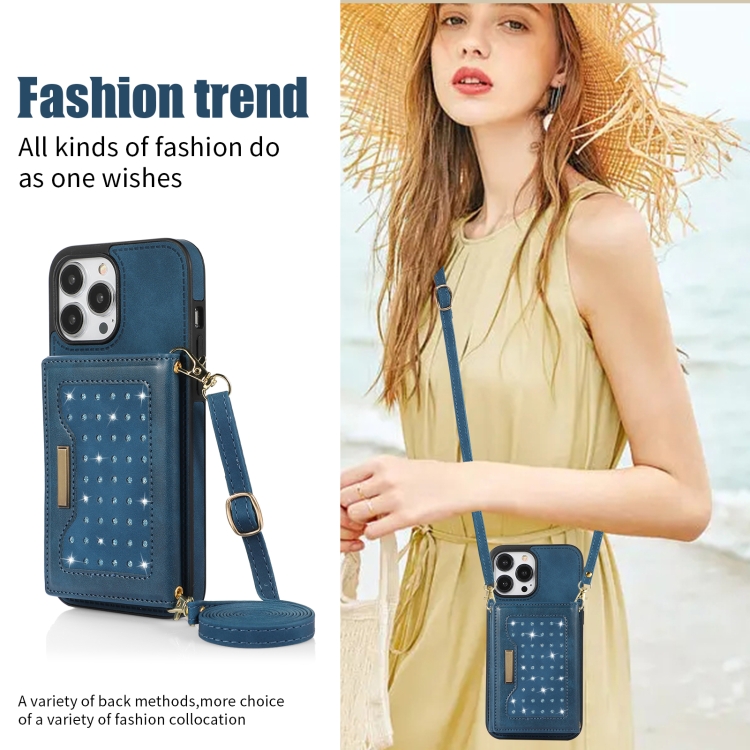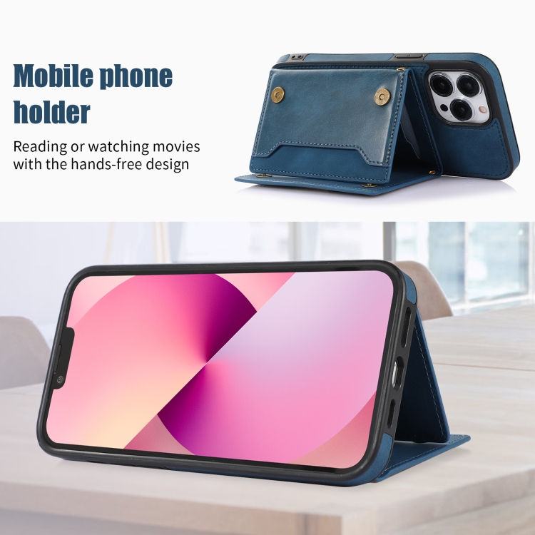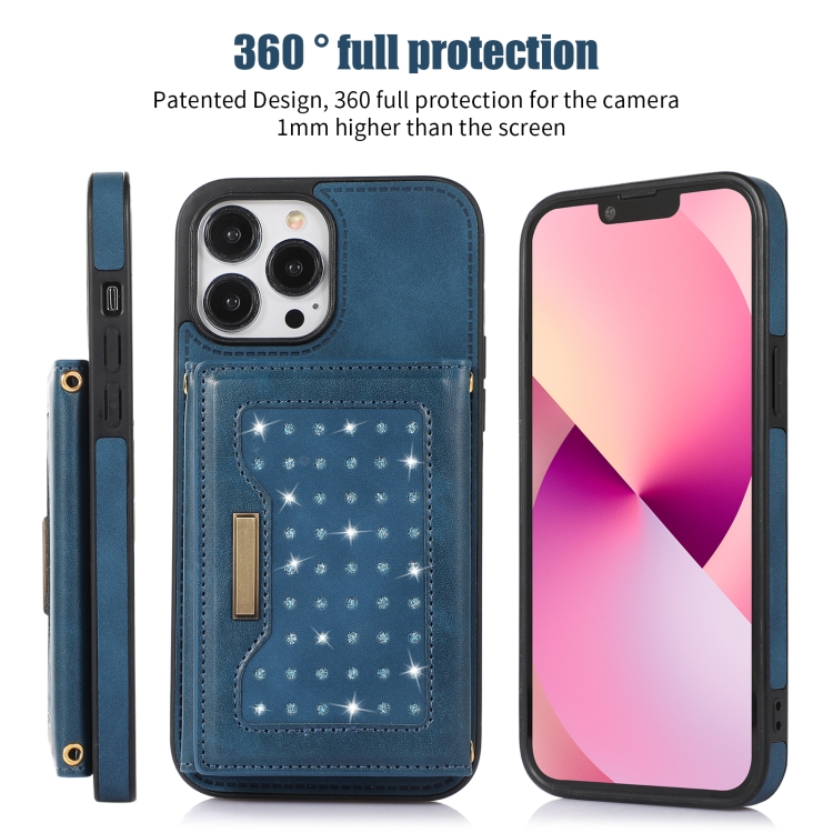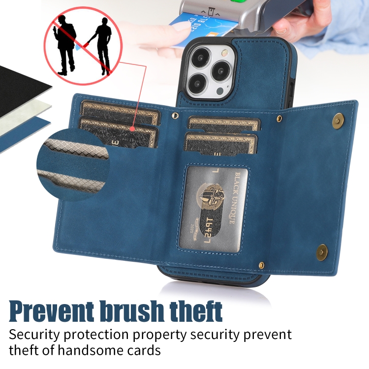 Estuche de Teléfono para iPhone 13 Pro Max Cuero Rfid Tres Pliegues con Cordón (Azul)