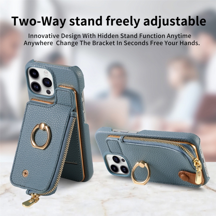 Funda Trasera para iPhone 13 Pro Max con Billetera, Cremallera y Anillo de Cuero Litchi (Azul Claro)