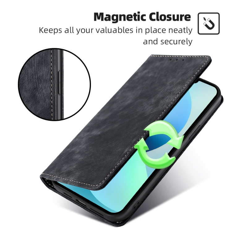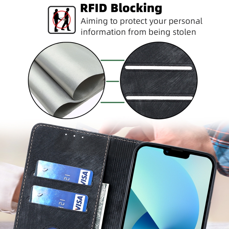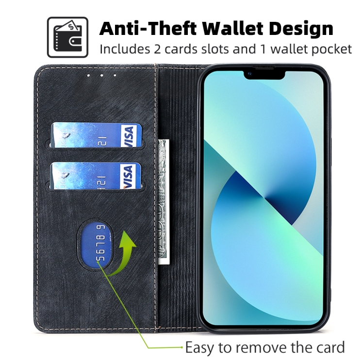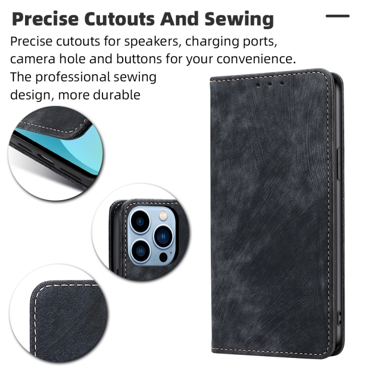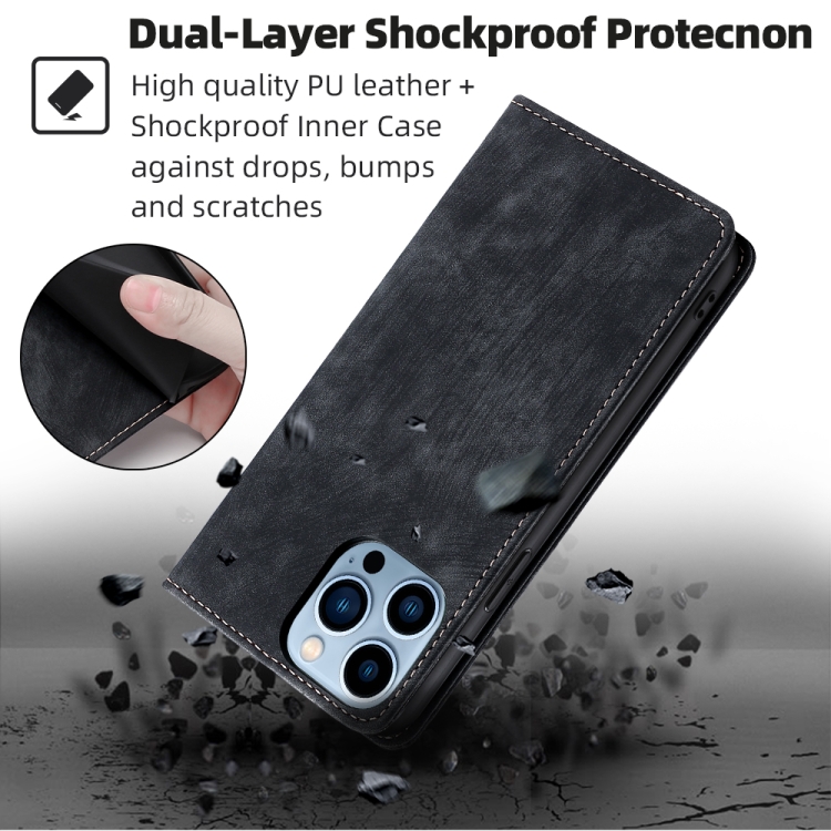 Funda de Cuero Magnético para iPhone 13 Pro con Protección RFID y Cepillo Antirrobo (Negro)