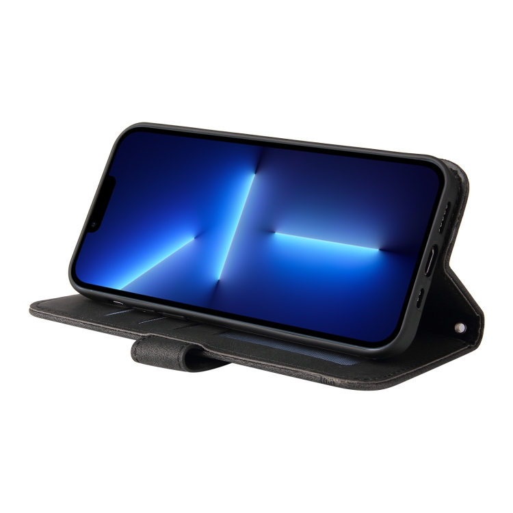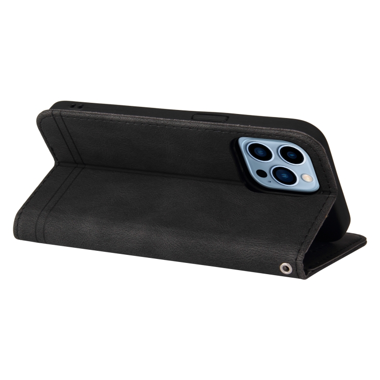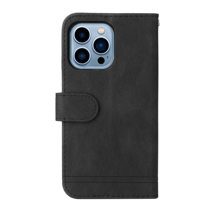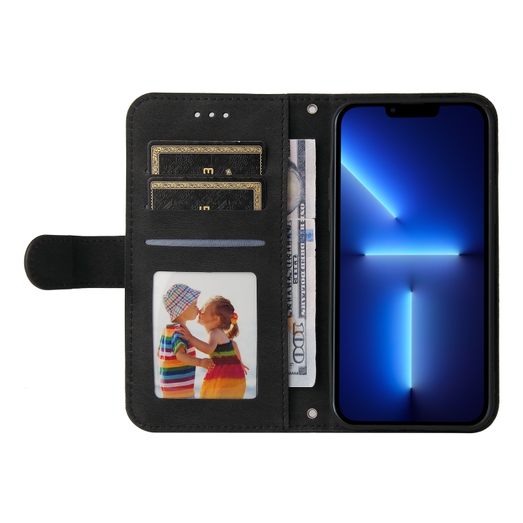 Funda de Cuero Skin Feel Life Tree para iPhone 13 Pro con Botón de Metal, Tapa Horizontal, Soporte, Ranura para Tarjeta, Billetera, Marco de Fotos y Correa (Negro)