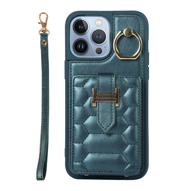 Funda para iPhone 13 Pro Vertical Card Bag Ring Holder con Doble Cordón (Verde Oscuro)