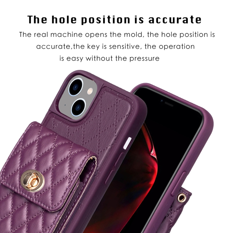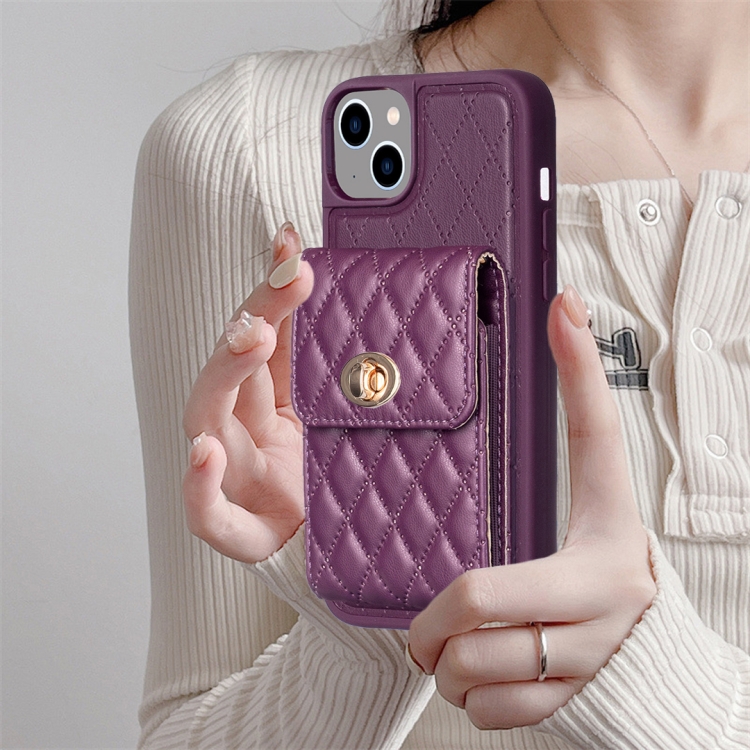 Caja de Teléfono de Cuero Rómbica para iPhone 14 Billetera con Hebilla de Metal Vertical (Púrpura Oscuro)
