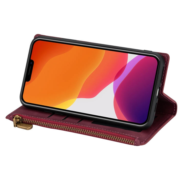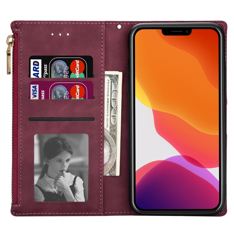 Funda para iPhone 14 Max Cremallera Ranuras para Tarjetas Múltiples Cuero con Tapa Horizontal (Rojo Vino)
