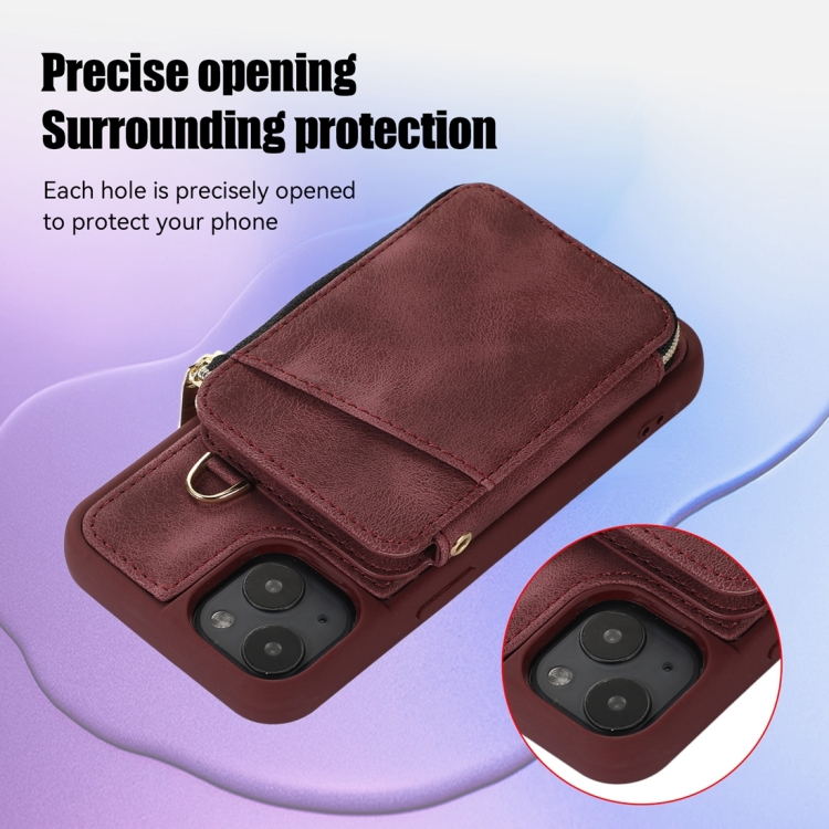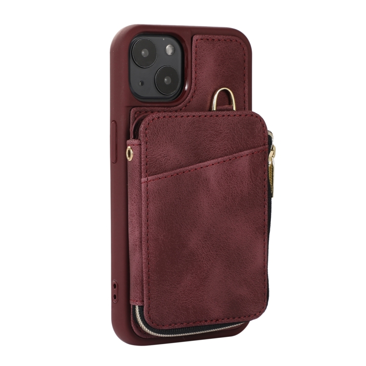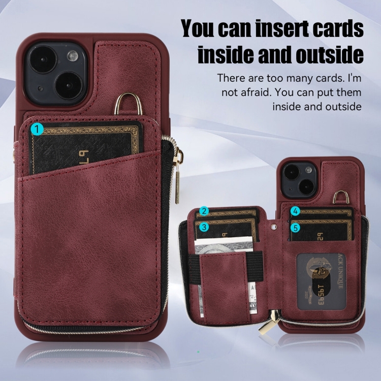 Funda para iPhone 14 Cremallera Tarjeta Bolsa Contraportada Caja del Teléfono (Vino Rojo)