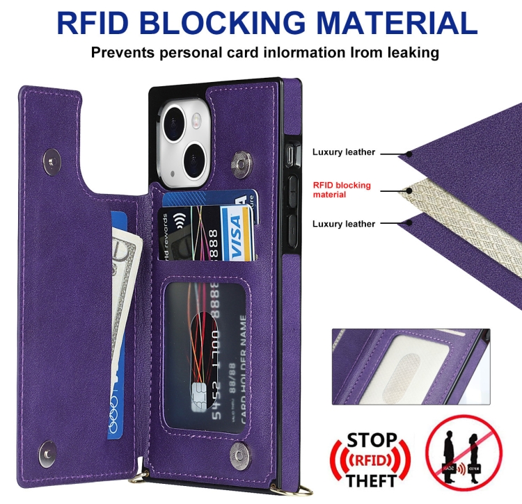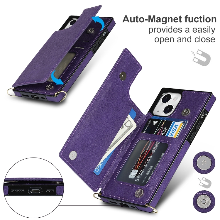 Funda para iPhone 14 Cross-Body Square Dual-Hebilla Tarjeta Flip Wallet (Púrpura)