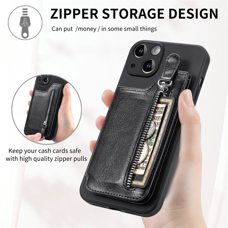 Funda para iPhone 14 con Cremallera y Parte Trasera de Cuero a Prueba de Golpes (Negro)