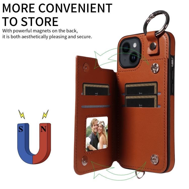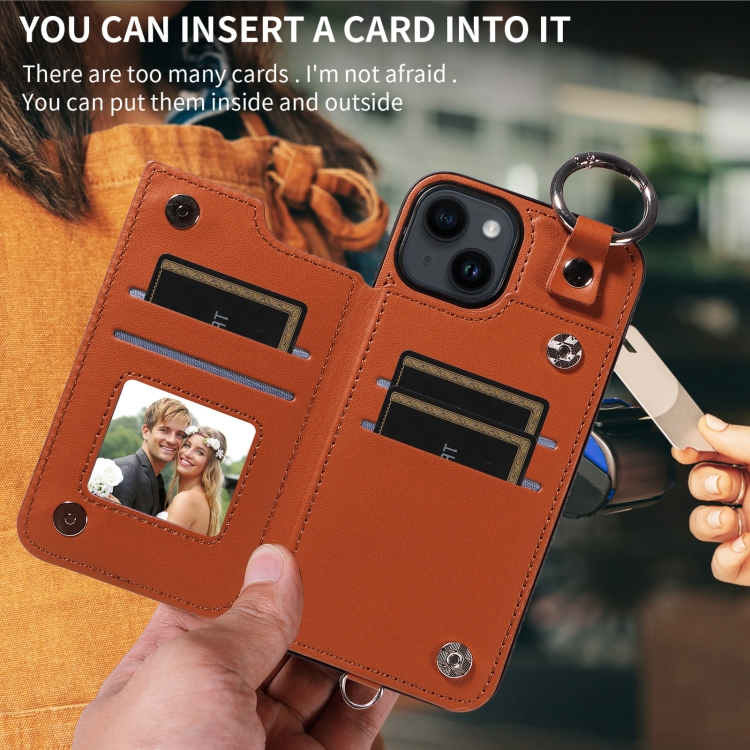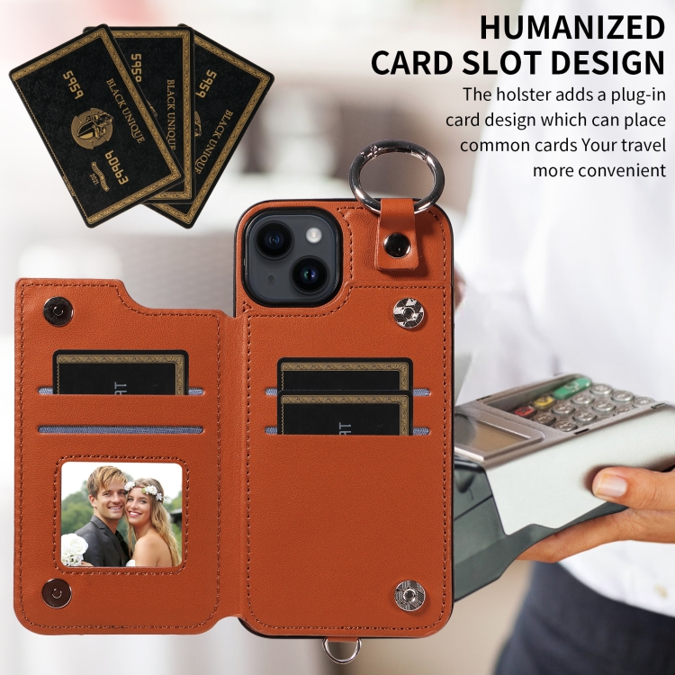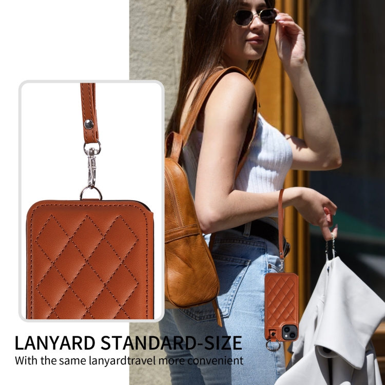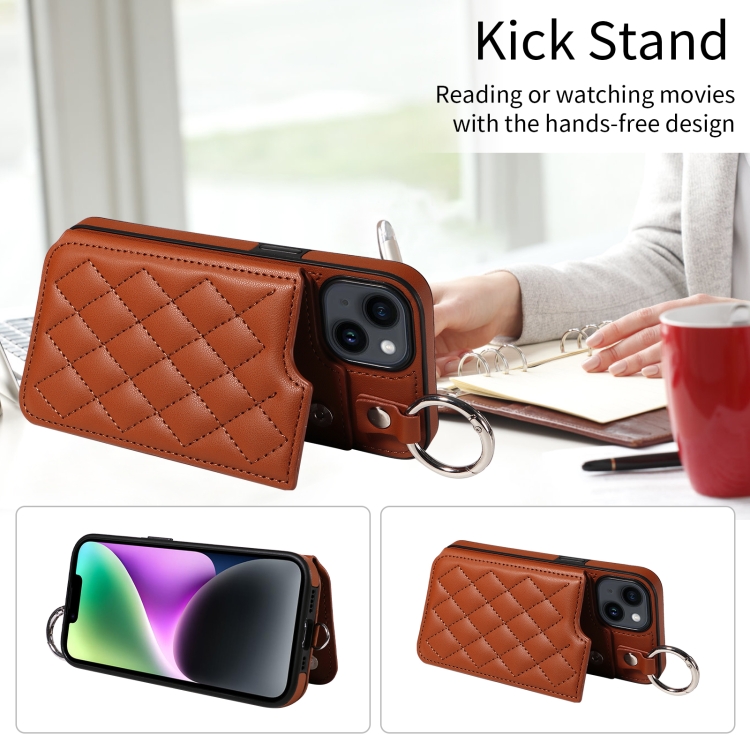 Funda para Teléfono para iPhone 14 con Bolsa para Tarjetas Textura Rómbica y Cordón Corto (Marrón)