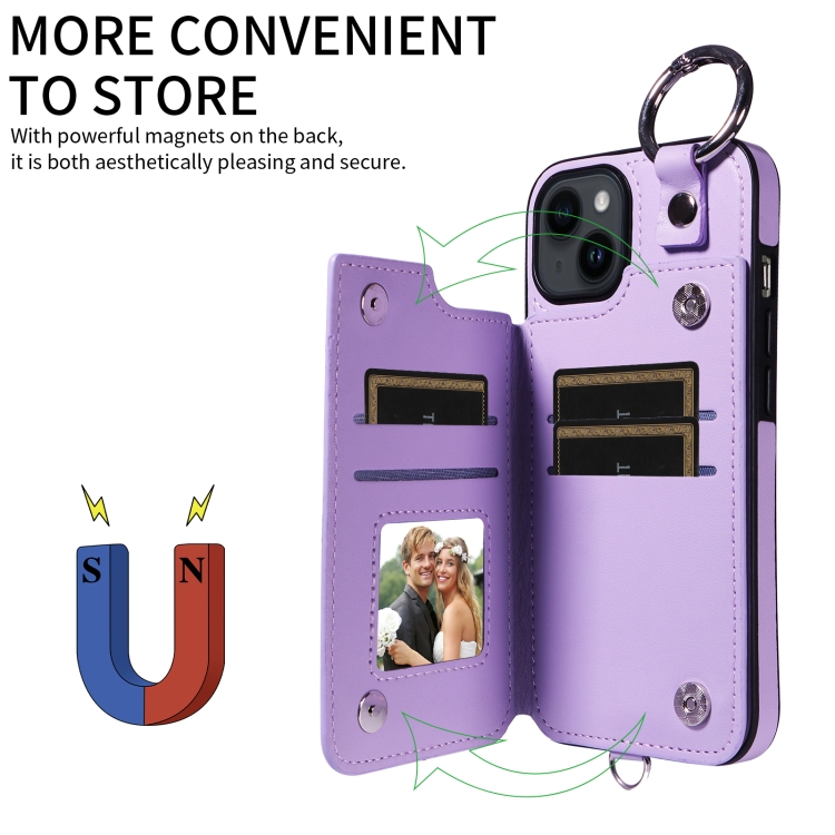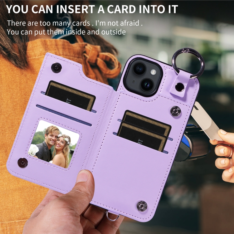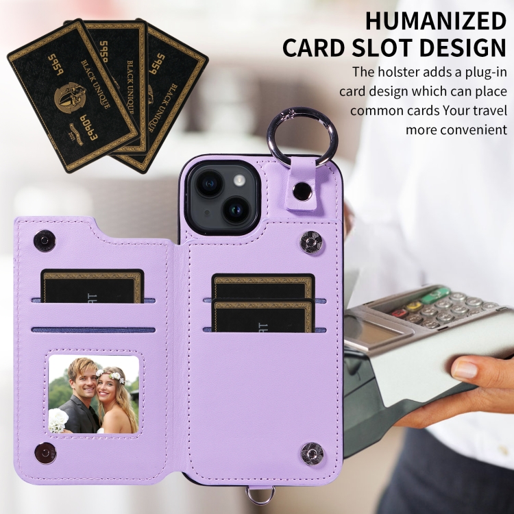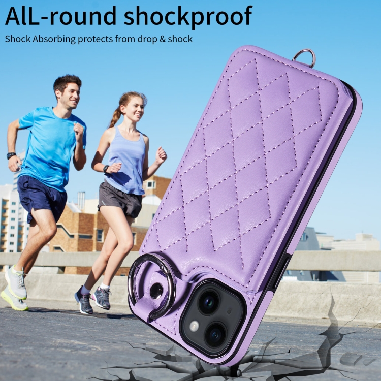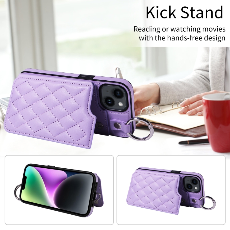 Funda para Teléfono iPhone 14 con Bolsa para Tarjetas Textura Rómbica y Cordón Corto (Púrpura)