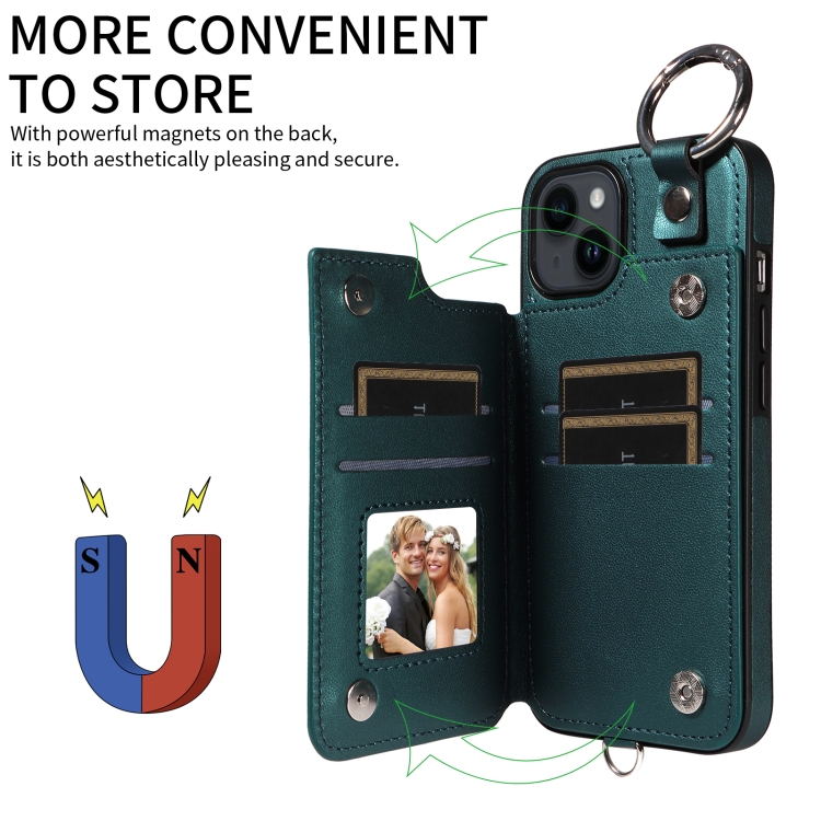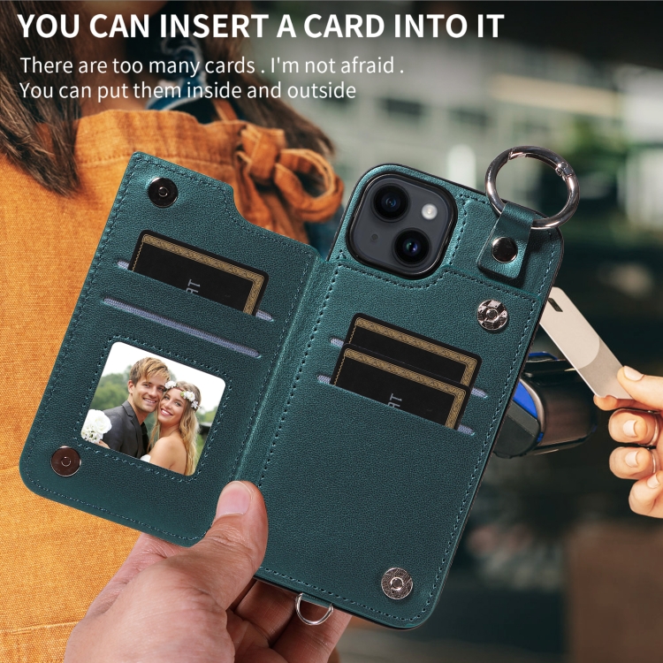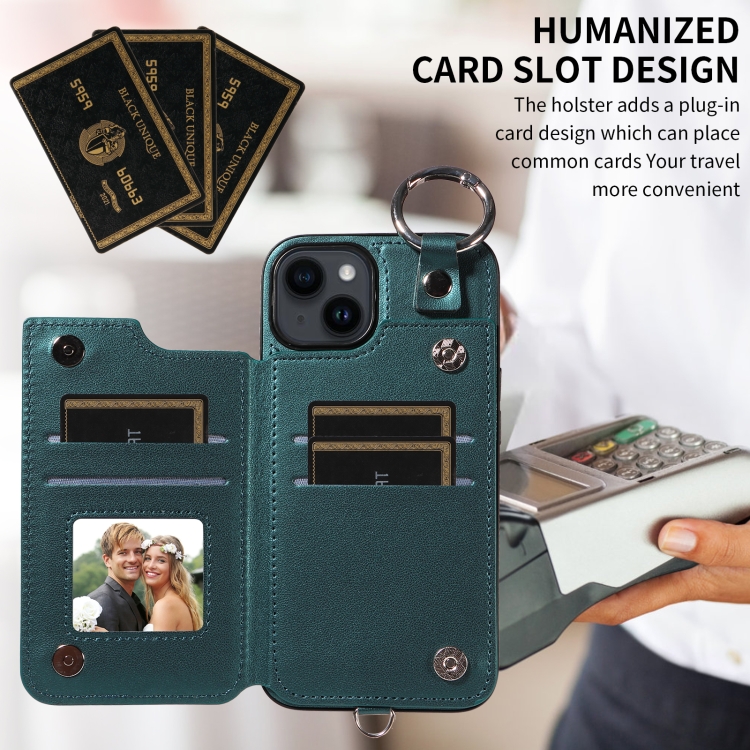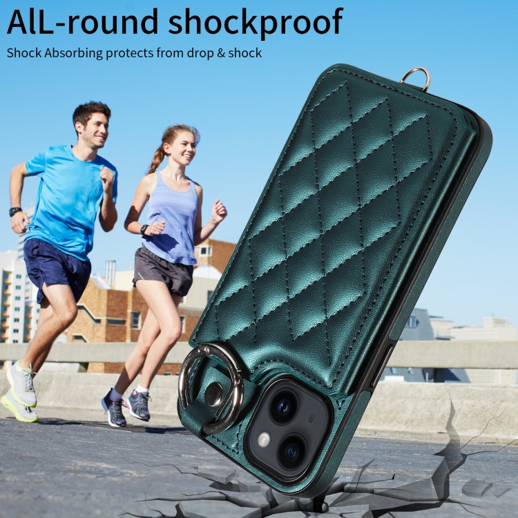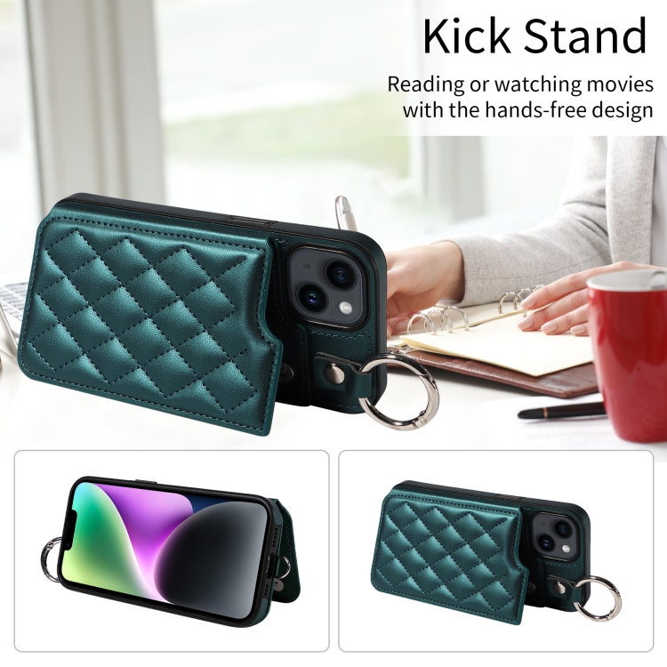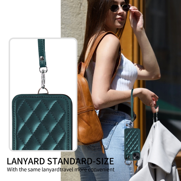 Funda para Teléfono iPhone 14 con Bolsa para Tarjetas Textura Rómbica y Cordón Corto (Verde)
