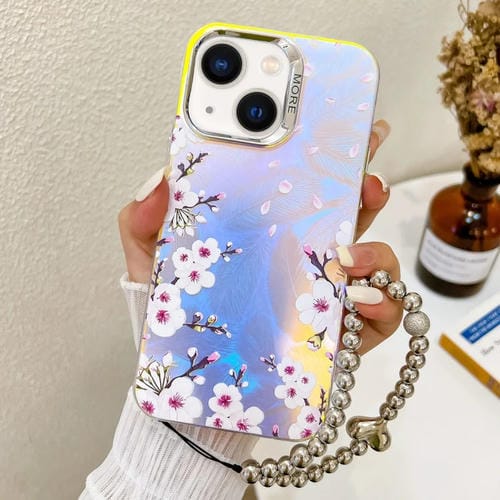 Funda para Teléfono iPhone 14 Plum Blossom Ah18 Flor Láser Galvanizada con Correa para la Muñeca