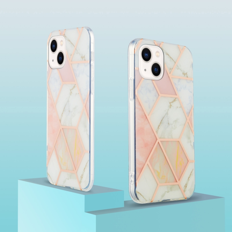 Funda para iPhone 14 Galvanoplastia Empalme Mármol Patrón Flores Doble Cara Imd TPU (Rosa Blanco)