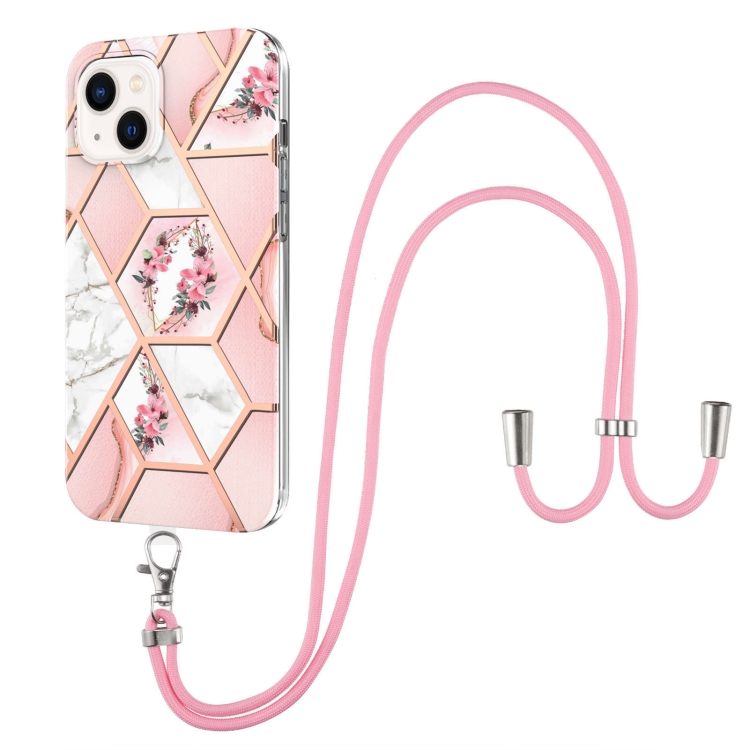 Estuche TPU para iPhone 14 Galvanoplastia Empalme Mármol Patrón de Flores a Prueba de Golpes con Cordón (Flor Rosa)