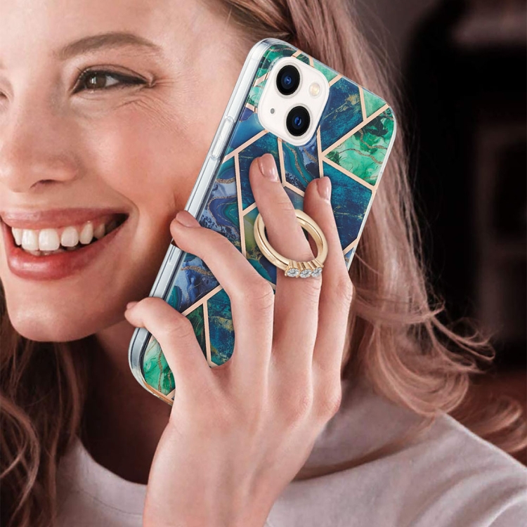 Estuche TPU para iPhone 14 Galvanoplastia Empalme Mármol Patrón Doble Cara con Soporte para Anillo (Azul Verde)